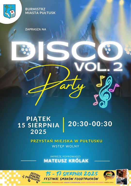 - 20:30 – 00:30 – Disco Party vol. 2 (Przystań Miejska w Pułtusku) – imprezę poprowadzi Mateusz Królak.