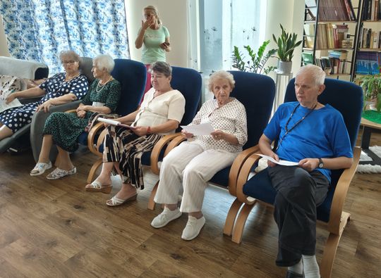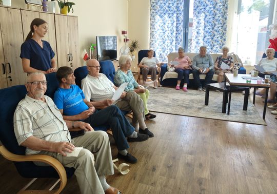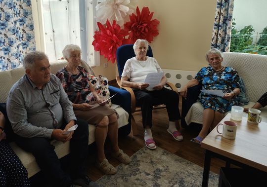 Pani KRYSTYNA, miłośniczka krzyżówek: - Mam czworo dzieci, ale byłam sama w domu, dzieci, owszem, przychodziły, ale tu jestem szczęśliwa, chociaż mam kłopoty z nogami. Ale swoje wiersze mogę recytować, podczas różnych naszych uroczystości (imieniny, urodziny, święta); mam je wszystkie w głowie, nie zapisuję. (Pani Krysia zarecytowała nam wiersz własnego autorstwa, gromko oklaskiwany).