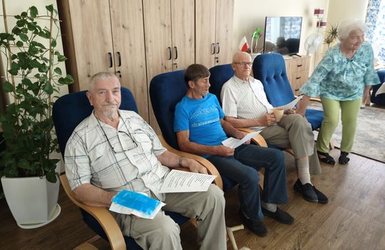 Robi się miło, wesoło. Rozwiązują się języki pań i panów. Na pierwszy ogień idzie pan JAN: - Krótko tu jestem, od stycznia, a można tu być, jak słyszę, około dwóch lat. Przebywamy w CENTRUM od godziny 8 do 16, z posiłkami, od poniedziałku do piątku. Zajęcia mamy bardzo ciekawe, też indywidualne rehabilitacje, ponadto gimnastykę, spotkania z psychologiem, które są nam bardzo pomocnie.
