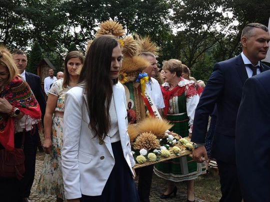 Za bramą rozstawiły się stoiska z jadłem, ciastami i napojami zagospodarowane przez panie z Kół Gospodyń Wiejskich, liczne i okazałe dmuchańce dla dzieci (dla najmłodszych przewidziano również animacje) i niezwykle estetyczna kryta scena, na której jako pierwszy wystąpił roztańczony zespół dziecięcy z Obrytego. Prócz stoisk z potrawami, były promocyjne i handlowe. Nie zabrakło różnorodnych obwarzanków, które po drodze na plac sprzedawały panie Maria i Agnieszka.